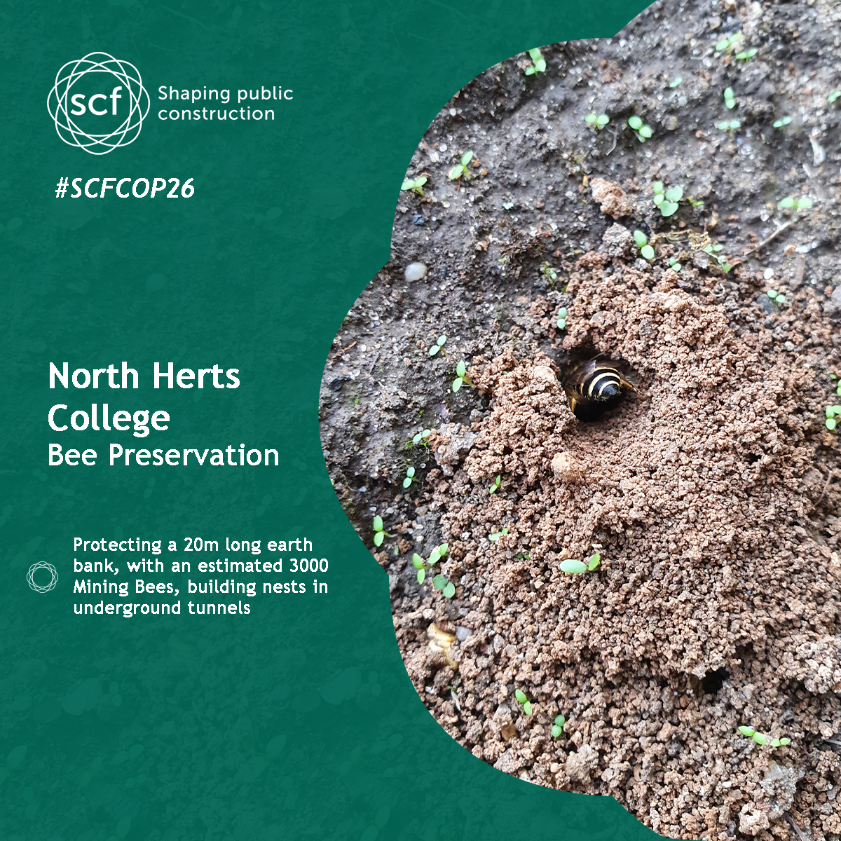 The team at Galliford Try took action to protect a large swarm of Mining Bees at North Herts College Sports Facilities, an SCF Project.
